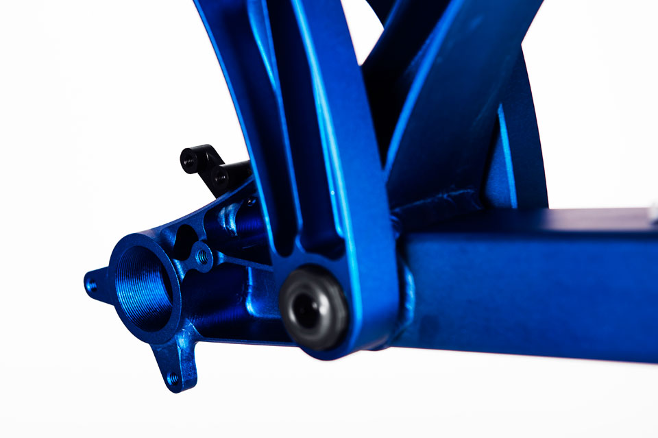 box-section links the back bone and headstock together with minimal welding (four hand-welded TIG fillets). The frame components are blasted with aluminium oxide/glass beads and then anodised for a tough, durable finish.